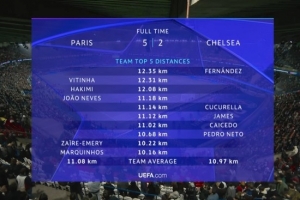 巴黎vs切尔西球员跑动距离:恩佐12.35公里最多,维蒂尼亚次席