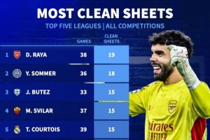 数据统计显示,本赛季欧洲五大联赛门将中,拉亚各项赛事出战38场比赛,有19场零封,零封场次最多。