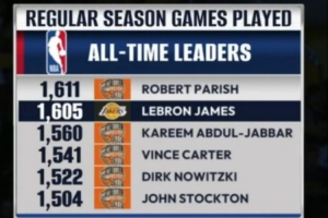 詹姆斯已经出战1605场常规赛历史第二,距离第一的帕里什只差6场,除了还在征战的詹姆斯,前六的另外五位球员都已经入选名人堂。