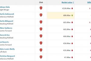 阿森纳本期身价变动(单位:欧元):